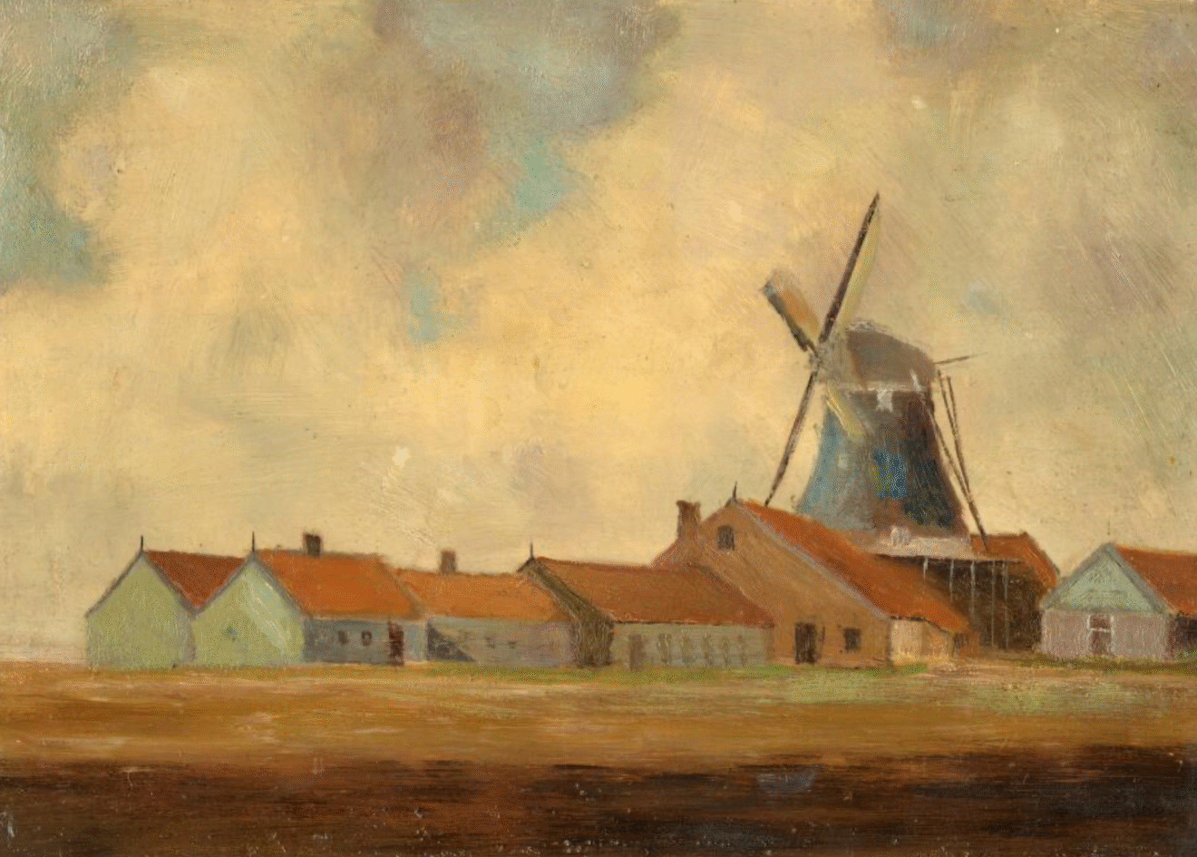 Witpapiermolen De Vergulde Bijenkorf gebouwd in opdracht Cornelis Honigh in 1668. Schilderij van J. Kruijver, foto De Zaansche Molen